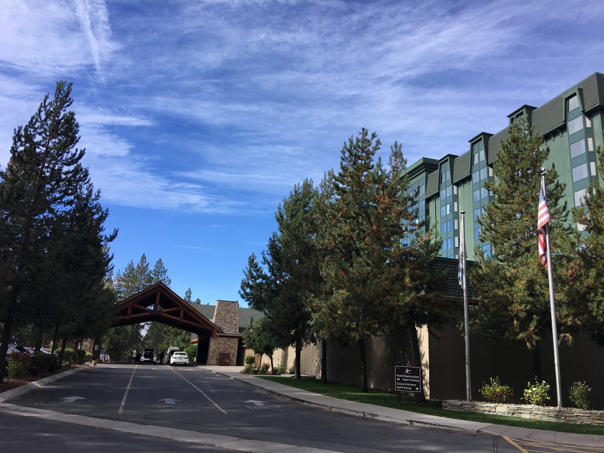 ホテル正面玄関。Country Club Drive上、湖へ向かって右側にホテルへの入口があります。入口はうっかりして1回通り過ぎてしまいました。入口入って左の正面玄関前でValet駐車が利用出来(1泊$24)、入口入ってそのまま進むとSelf駐車が利用出来ます(1泊$18)。ValetはともかくSelfも駐車場代かかります。