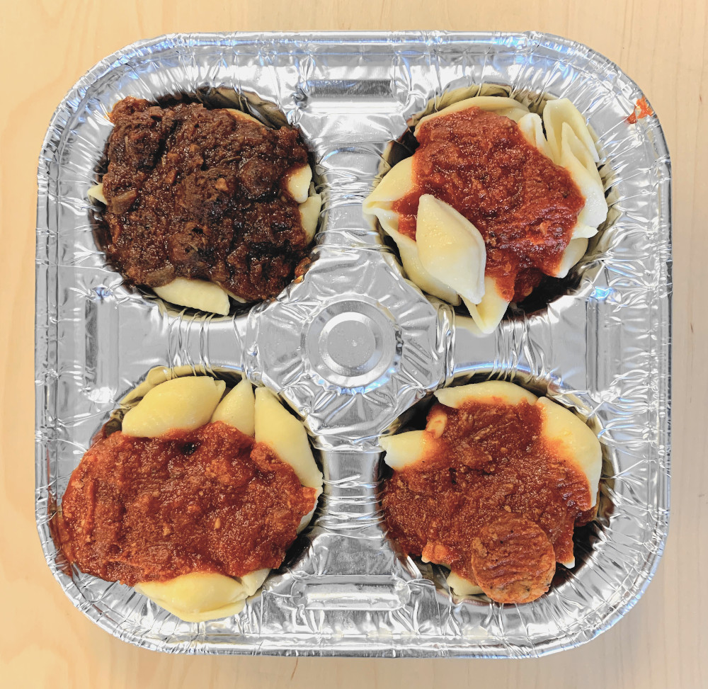 ソース・テイスティングの会場へ行って、$5のパスタ(マフィンパン)を購入します。看板の絵はロングパスタですが、提供されるのは4つのマフィン型に入れられたショートパスタです。