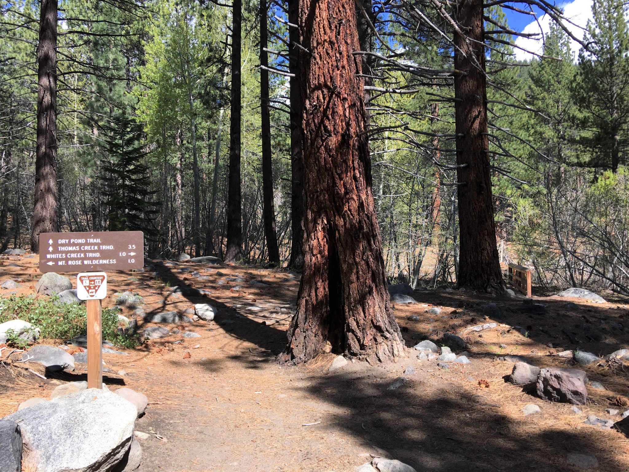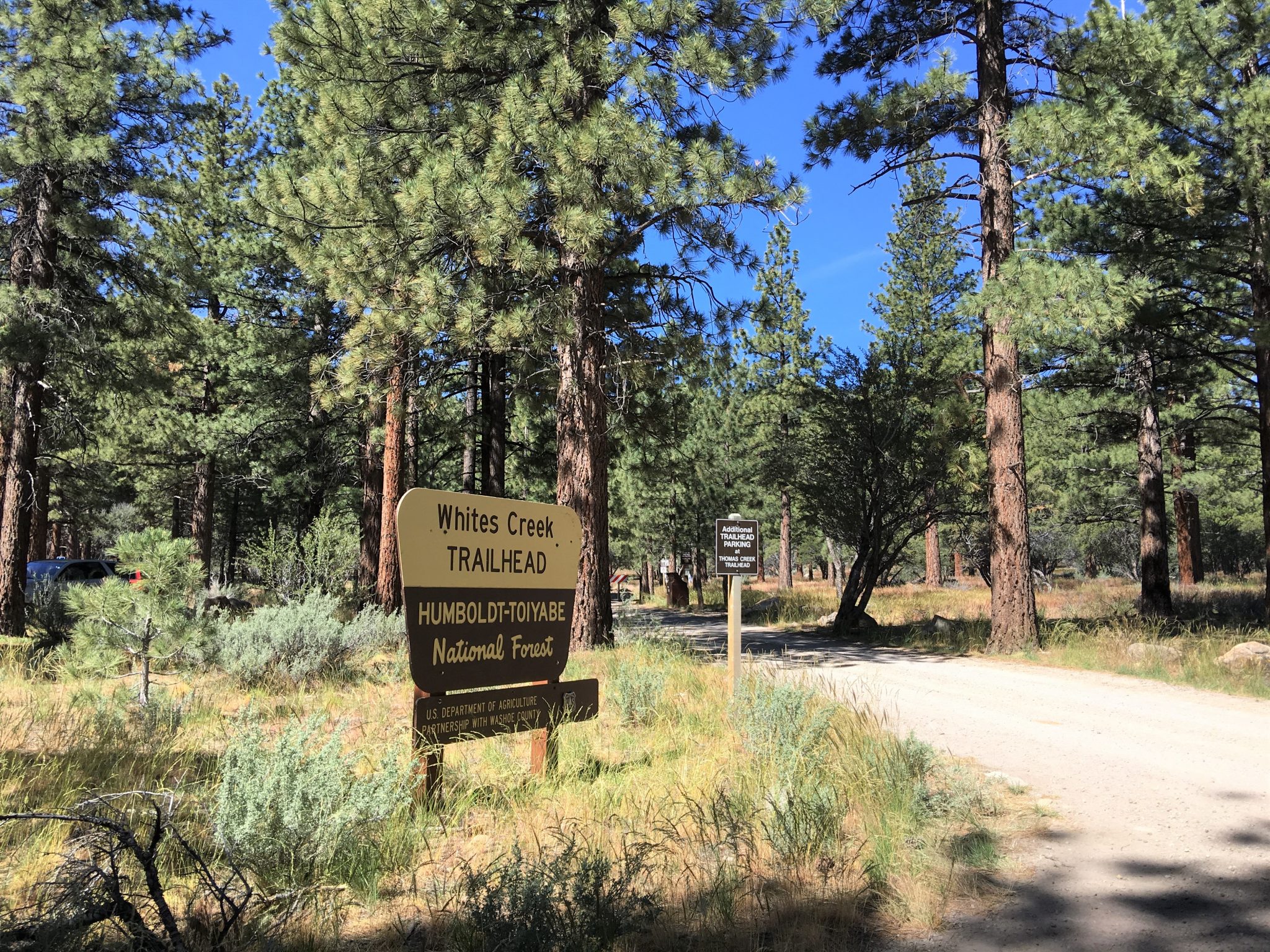 このTrailはビジターセンターのあるメインエントランスのエリアとは離れていて、Mt.Rose Hwy (州道431号線) をMt.Roseへ向かいメインエントランスよりも手前、2車線が1車線になる直前の角、Timberline Rd.を右へ入り数分で左に見える上写真の看板のところを左へ入ったWhite Creek Trailheadからのアクセスが最寄りとなります。